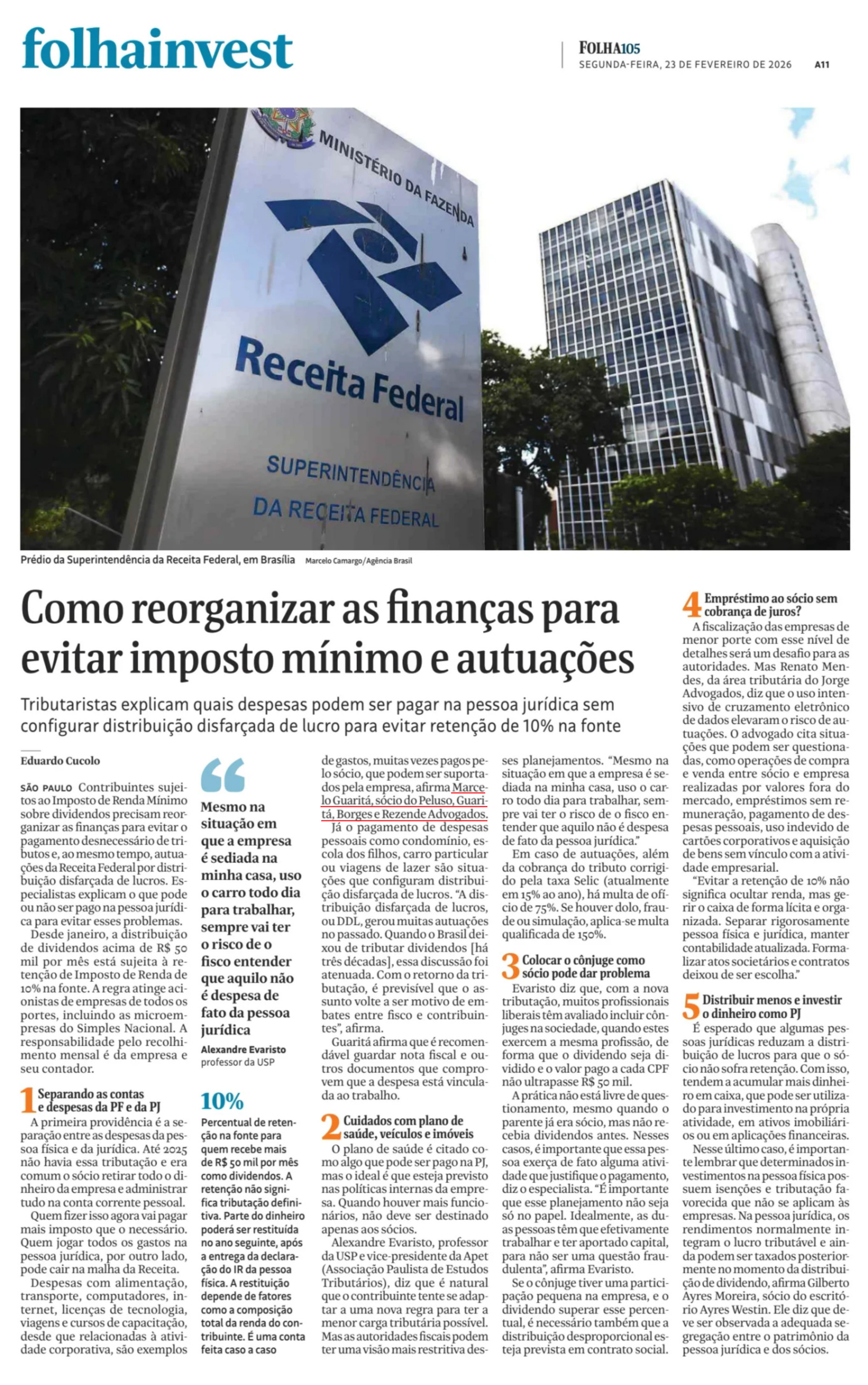 “Evitar a retenção de 10% não significa ocultar renda, mas gerir o caixa de forma lícita e organizada. Separar rigorosamente pessoa física e jurídica, manter contabilidade atualizada. Formalizar atos societários e contratos deixou de ser escolha.”