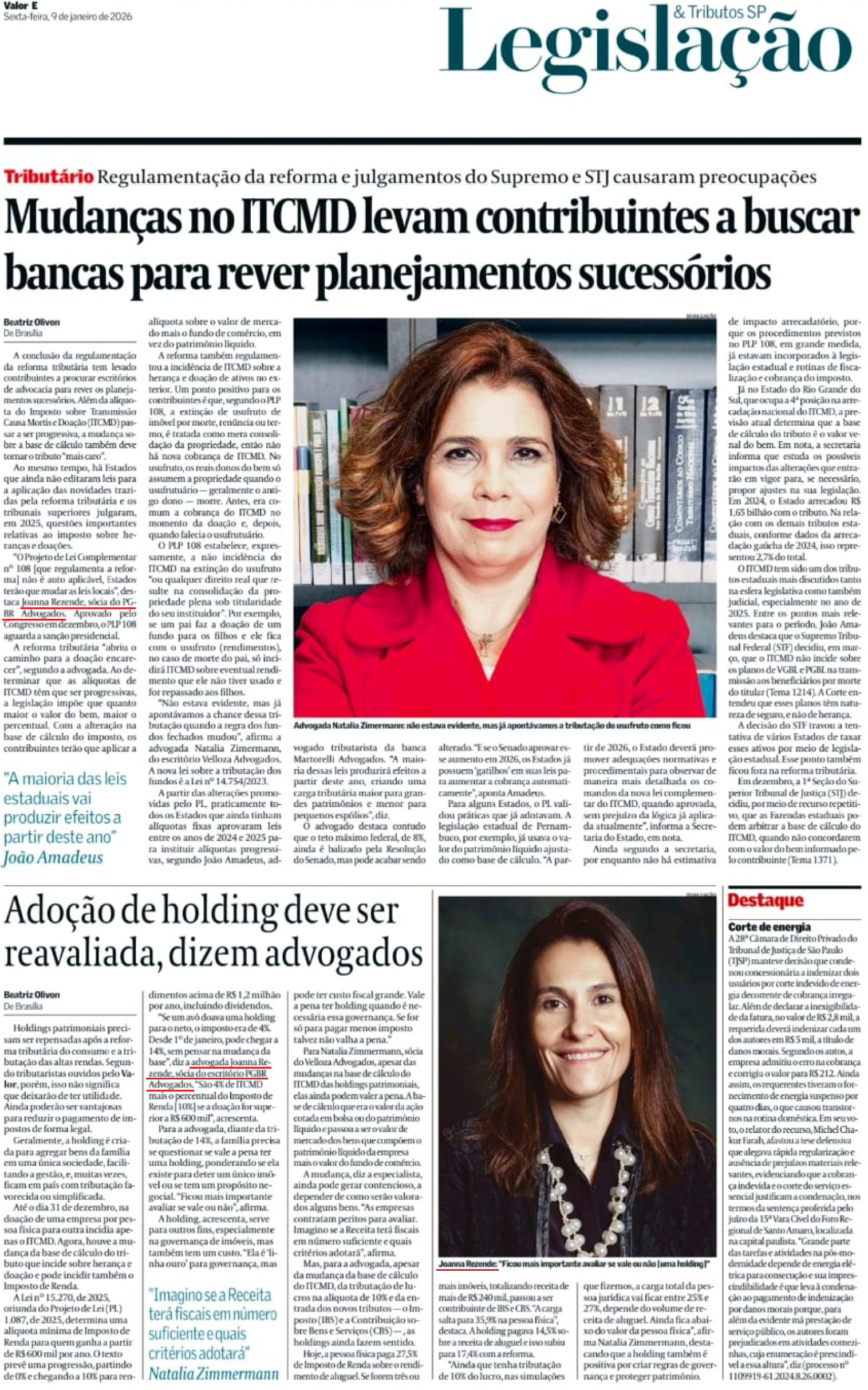 Já no Estado do Rio Grande do Sul, que ocupa a 4ª posição na arrecadação nacional do ITCMD, a previsão atual determina que a base de cálculo do tributo é o valor venal do bem. Em nota, a secretaria informa que estuda os possíveis impactos das alterações que entrarão em vigor para, se necessário, propor ajustes na sua legislação. Em 2024, o Estado arrecadou R$ 1,65 bilhão com o tributo. Na relação com os demais tributos estaduais, conforme dados da arrecadação gaúcha de 2024, isso representou 2,7% do total.