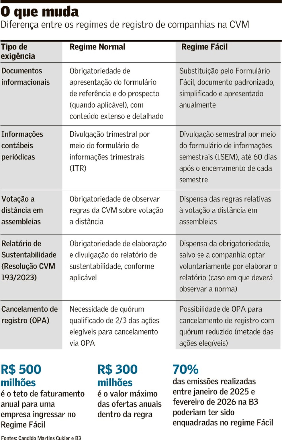 Em vigor há pouco mais de um mês, o Regime de Facilitação do Acesso a Capital e de Incentivos a Listagens (Fácil) tem sido percebido pelas empresas de médio porte como um caminho para acessar capital mais barato do que o crédito bancário tradicional. Criado pela Comissão de Valores Mobiliários (CVM) para reduzir os custos de acesso ao mercado de capitais das companhias com receita bruta anual consolidada inferior a R$ 500 milhões, o Regime Fácil tem sido reconhecido principalmente como um instrumento para operações de dívida mais simples, como emissões de notas comerciais.